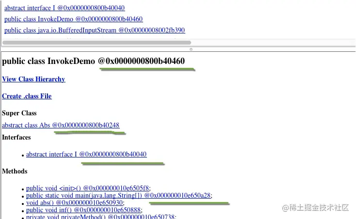我们依然使用上面的代码片段看一下前四个指令的使用场景。代码中包含一个接口I,一个抽象类Abs,一个实现和继承了两者的类InvokeDemo。