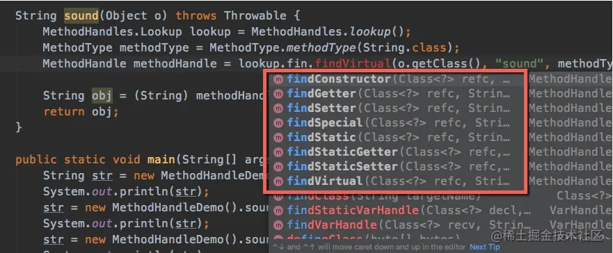 其实,invokedynamic指令的底层,是使用方法句柄(MethodHandle)来实现的。方法句柄是一个能够被执行的引用,它可以指向静态方法和实例方法,以及虚构的get和set方法,从IDE中可以看到这些函数。