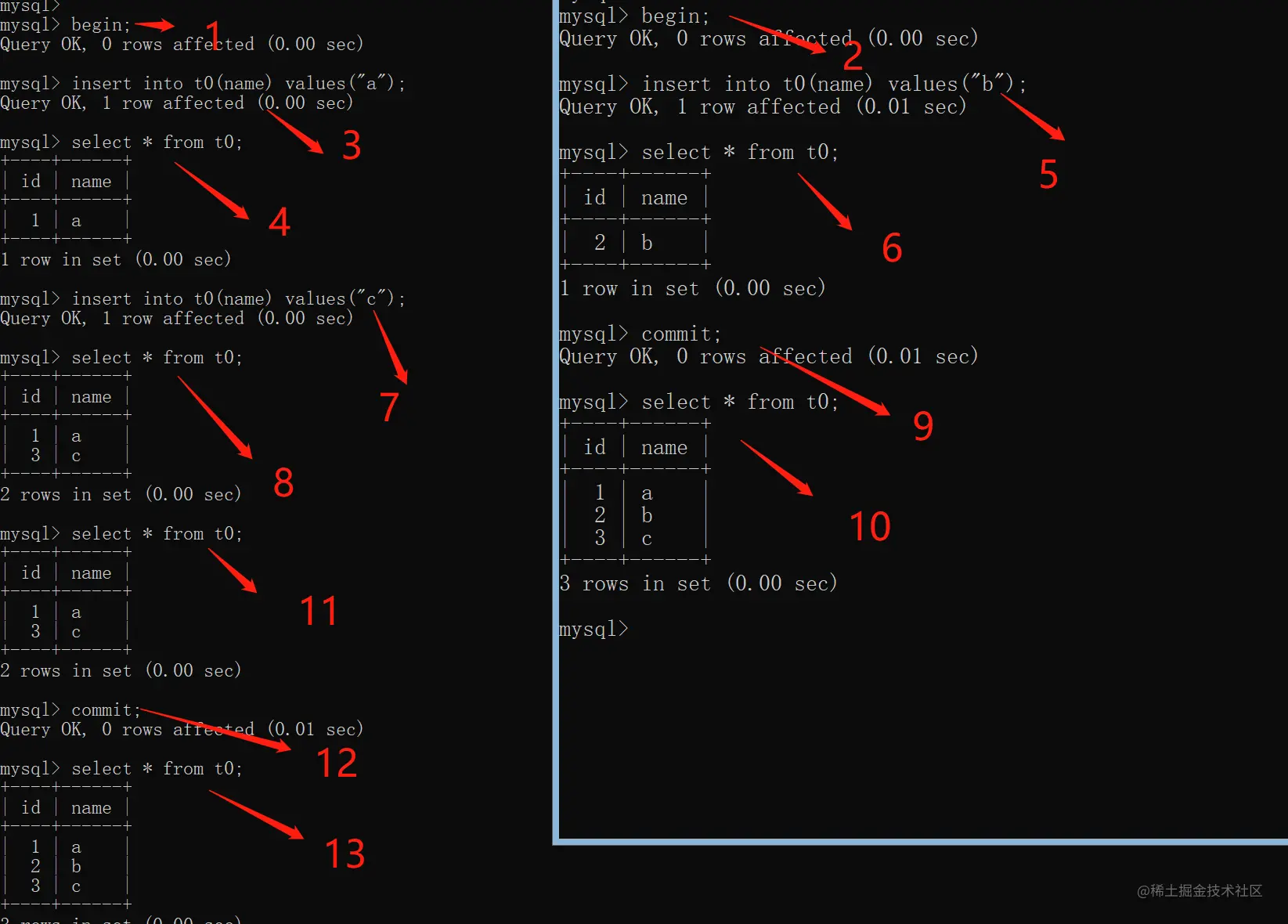 - 事务B会话中的自增列直接从2开始增加的。(如上图步骤5、6)