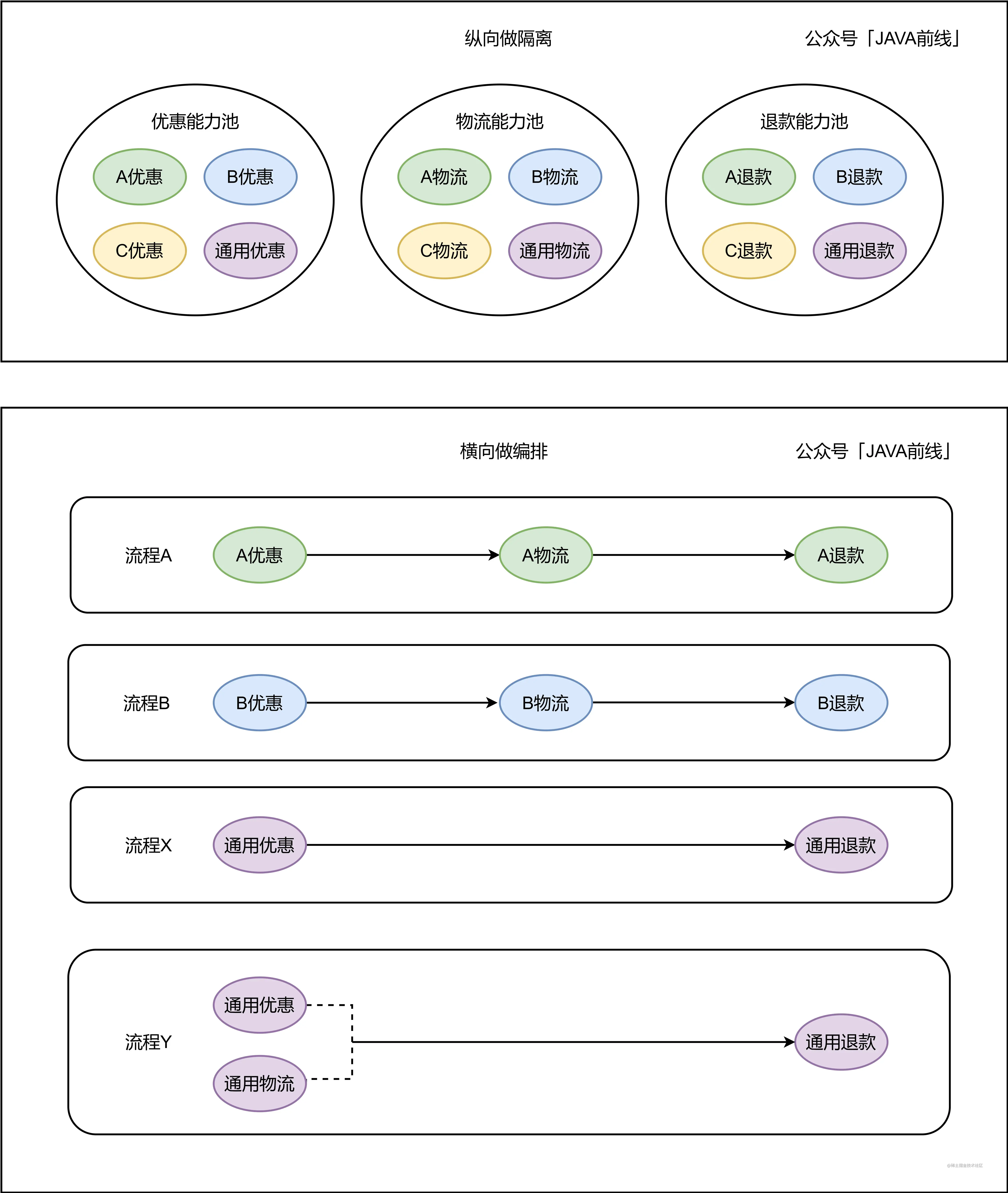纵向维度抽象出能力池这个概念,能力池中包含许多能力,不同的能力按照不同业务维度聚合,例如优惠能力池,物流能力池,退款能力池。我们可以看到两种程度的隔离性,能力池之间相互隔离,能力之间也相互隔离。