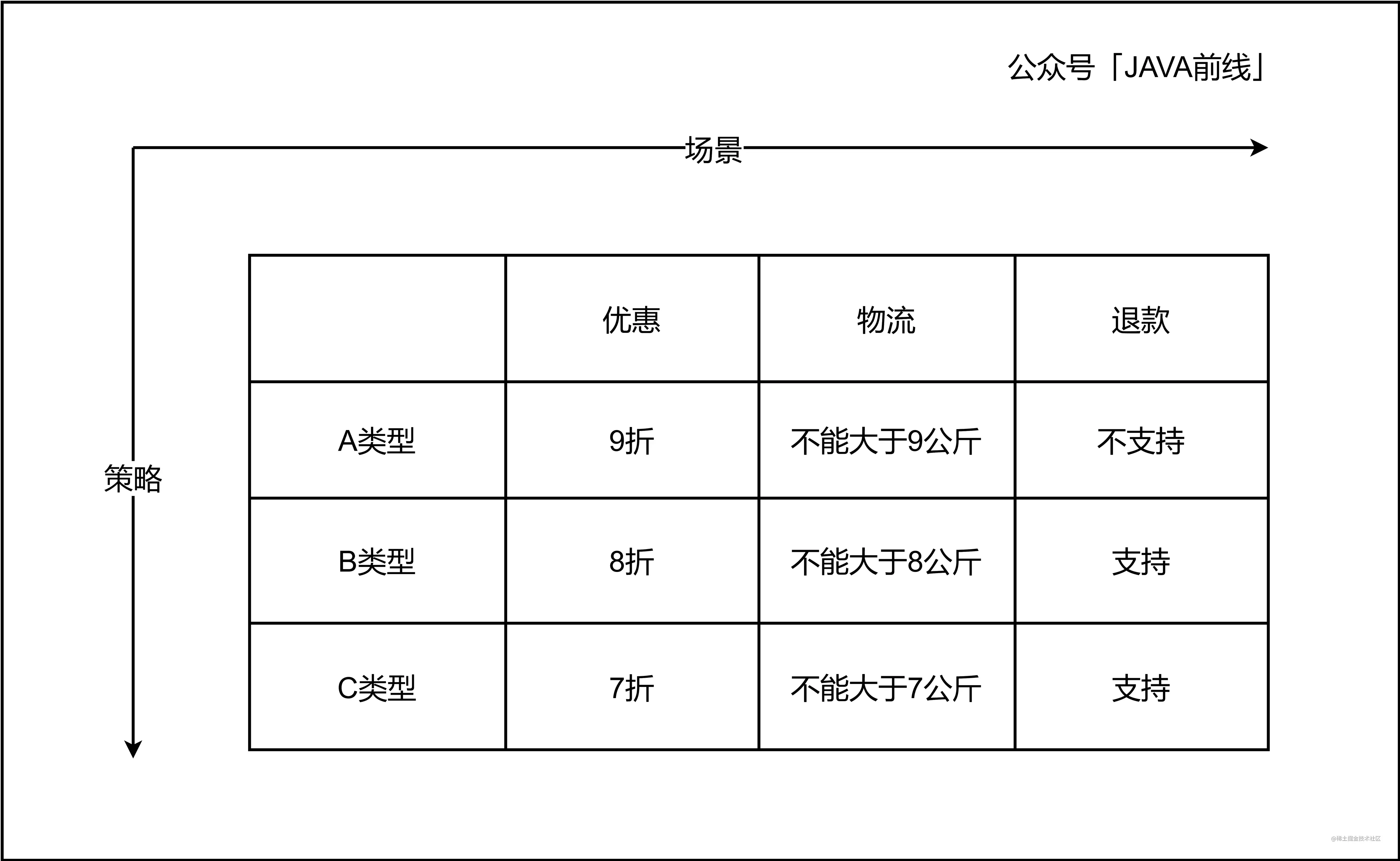 纵向维度表示策略,不同策略在逻辑上和业务上应该是隔离的,本实例包括优惠策略、物流策略和退款策略,策略作为抽象,不同订单类型去扩展这个抽象,策略模式非常适合这种场景。本文详细详细分析优惠策略,物流策略和退款策略同理。