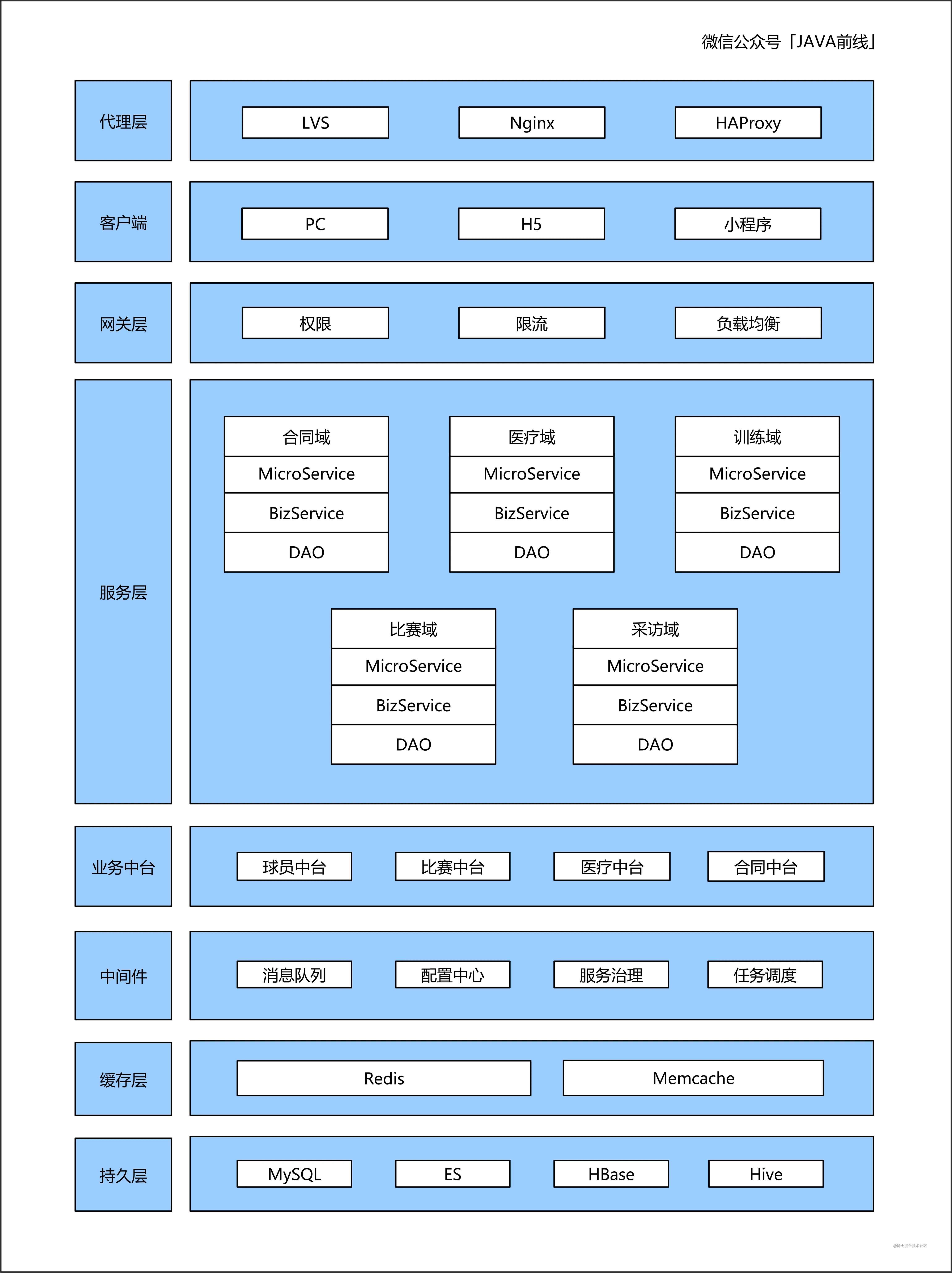 架构总体而言分为两个层次,第一种层次是指本项目在整个公司位于哪一层。持久层、缓存层、中间件、业务中台、服务层、网关层、客户端和代理层是常见的分层架构,大多数情况下业务需求最终会体现在服务层,不同的领域对应不同的微服务。