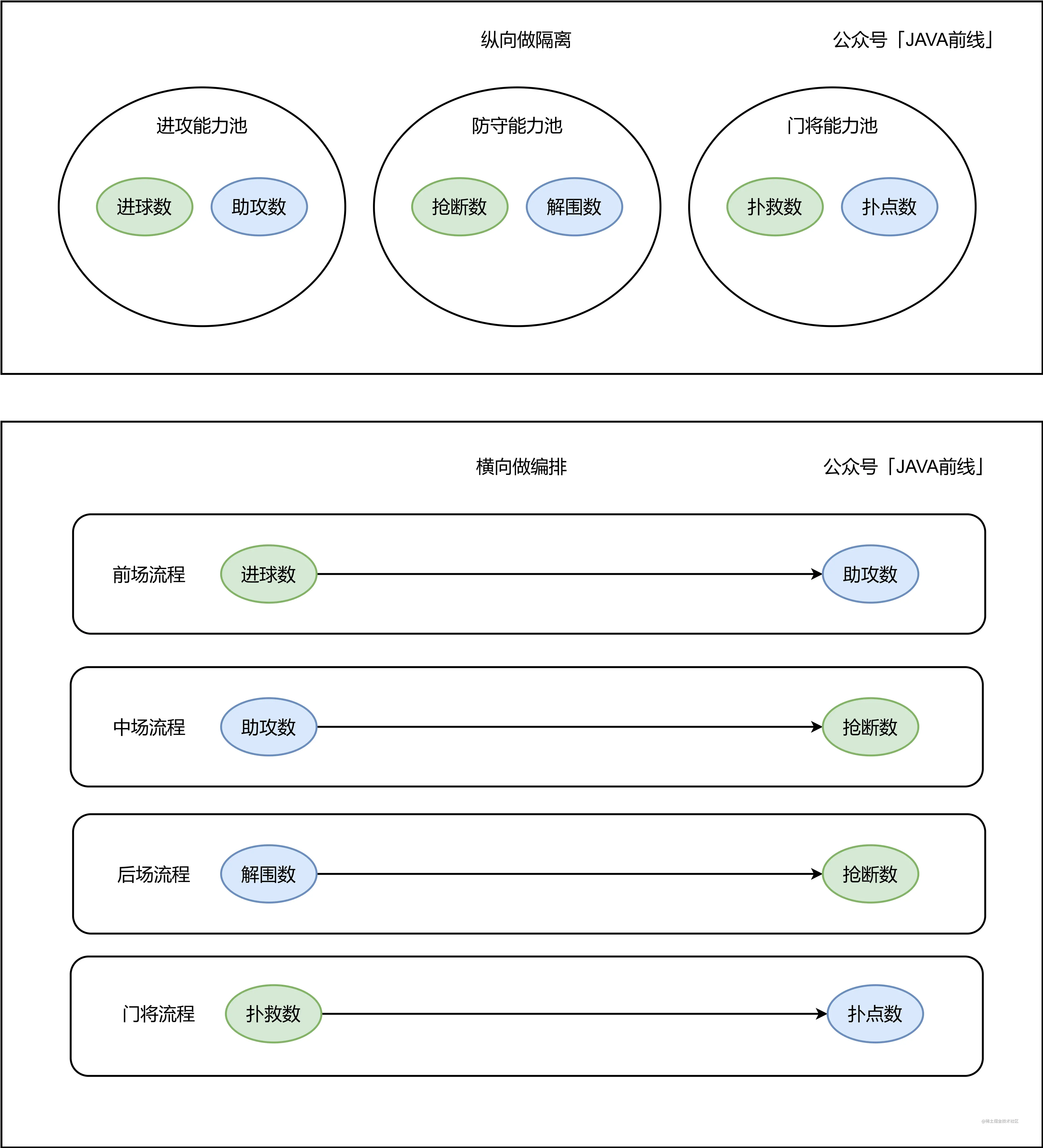 纵向隔离出进攻能力池,防守能力池,门将能力池,横向编排出前场、中场、后场、门将四个流程,在不同流程中可以任意从能力池中选择能力进行组合,而不是编写冗长的判断逻辑,显著提升了代码可扩展性。