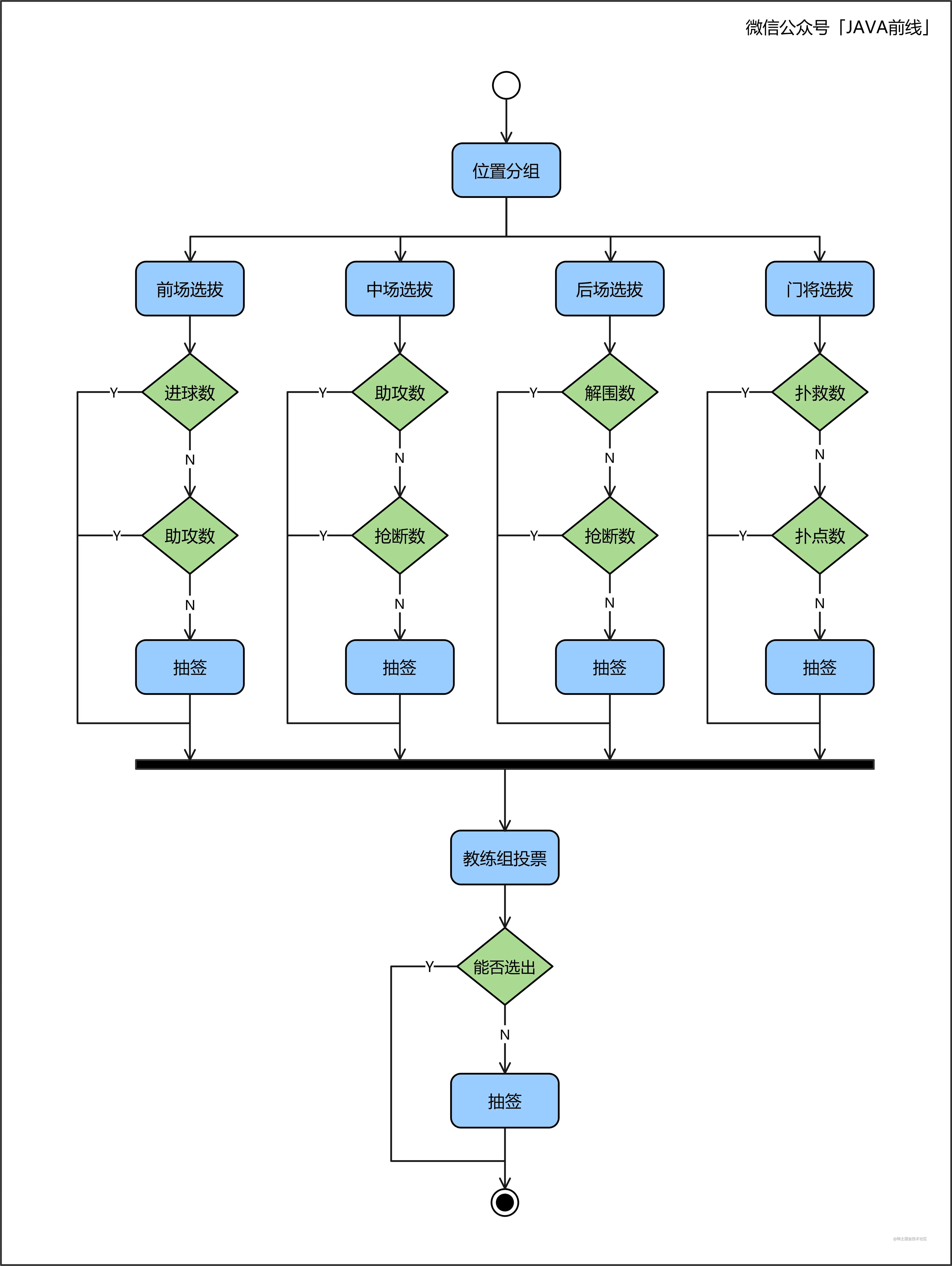 活动图适合描述复杂逻辑分支,设想这样一种业务场景,球队需要选出一名球员成为球队的足球先生,选拔标准如下:前场、中场、后场、门将各选出一名候选球员。前场队员依次比较进球数、助攻数,中场队员依次比较助攻数、抢断数,后场队员依次比较解围数、抢断数,门将依次比较扑救数、扑点数,如果所有指标均相同则抽签。每个位置有人选之后,全体教练组投票,如果投票数相同则抽签。