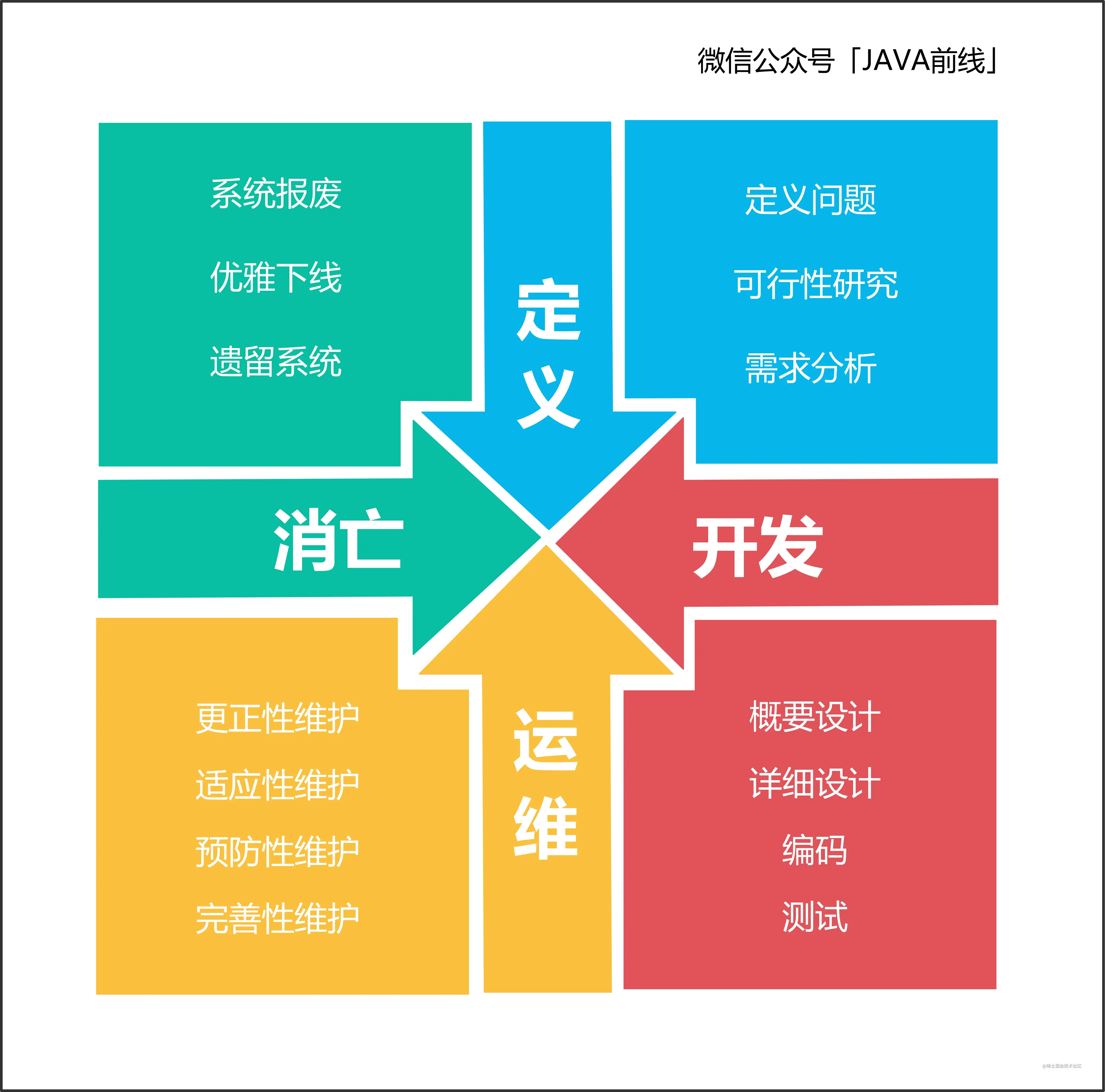 生命周期每个阶段固然有各自的重要性,但是开发者更应该关注定义阶段与开发阶段。定义阶段需要解决为什么开发(why)、需求是什么(what)两个问题,开发阶段需要解决怎么设计,怎么编码,怎么测试(how)三个问题。