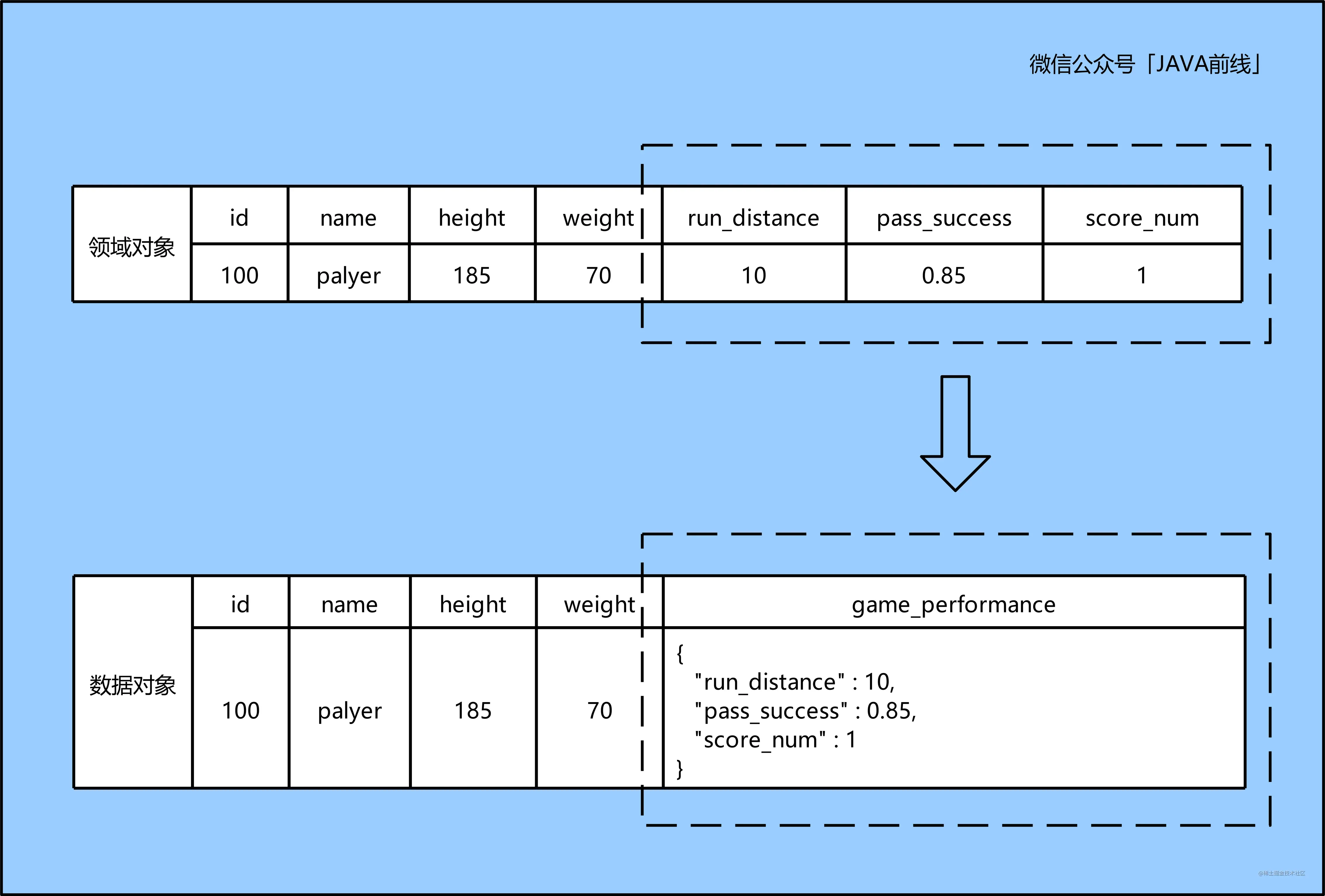 现在我们需要管理足球运动员基本信息和比赛数据,对应领域模型和数据模型应该如何设计?姓名、身高、体重是一名运动员本质属性,加上唯一编号可以对应实体对象。跑动距离,传球成功率,进球数是运动员比赛表现,这些属性的集合可以对应值对象。