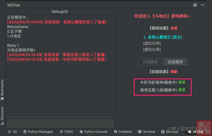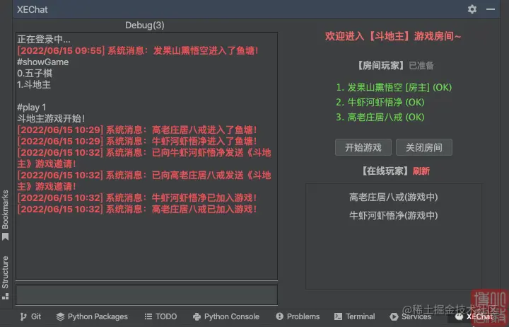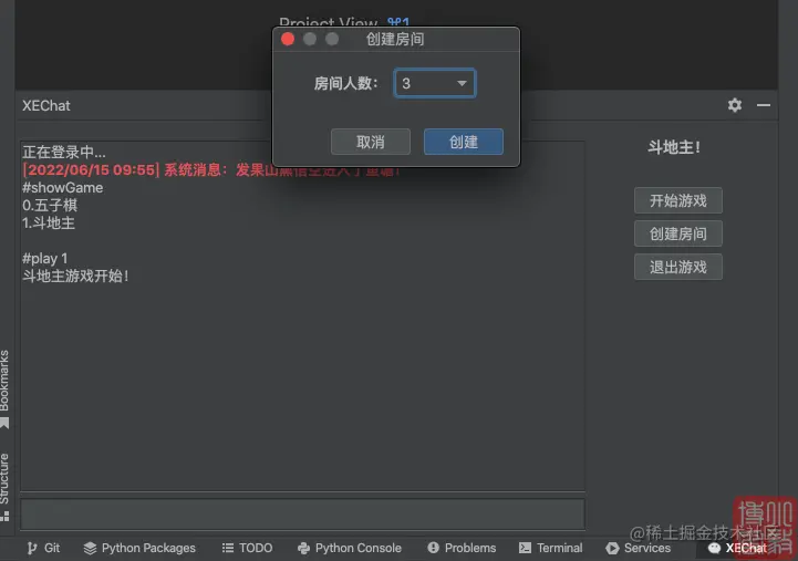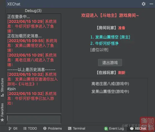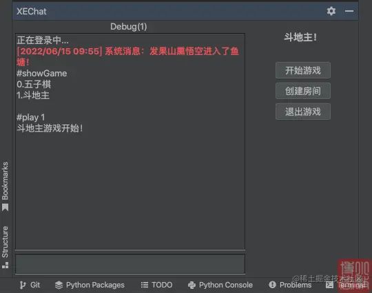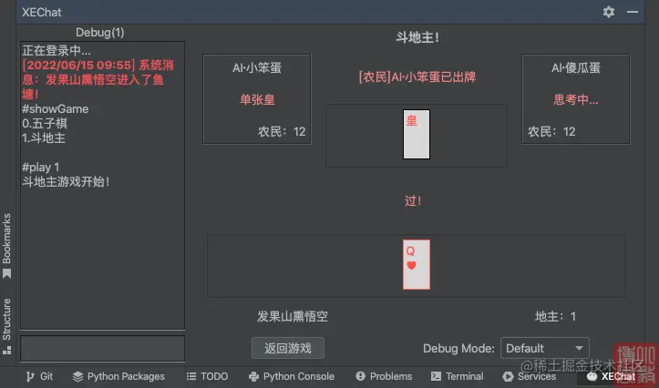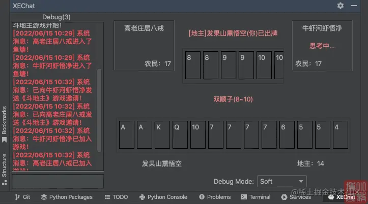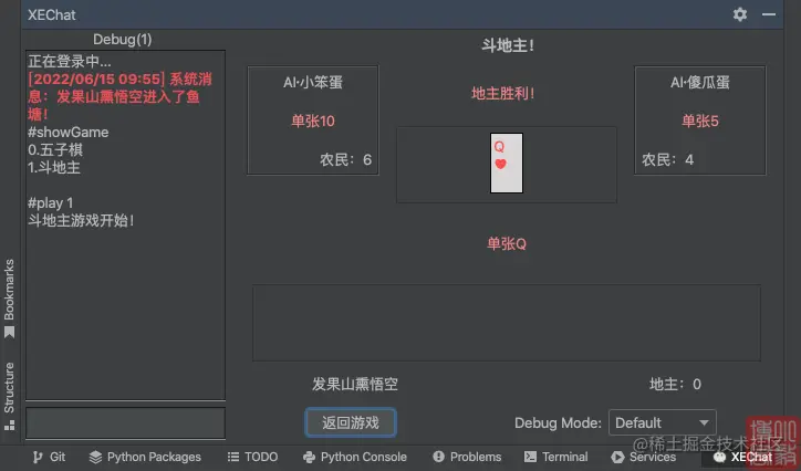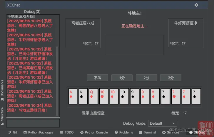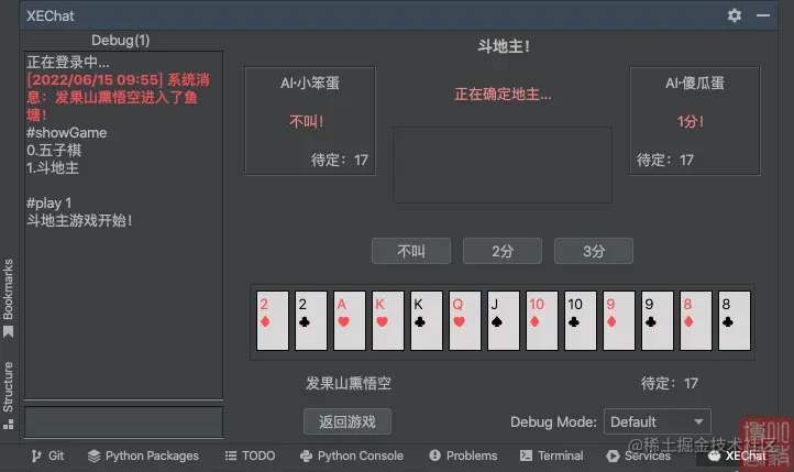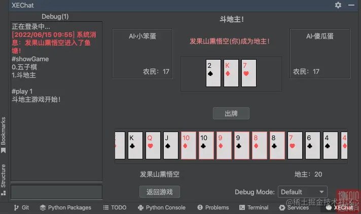 文章介绍了如何在集成开发环境IDEA中进行斗地主游戏,包括登录、查看游戏列表、运行游戏的命令行操作。游戏支持人机对战和联网模式,特别提到了DebugMode的三种显示模式,允许开发者在工作时低调进行游戏而不引起注意。此外,还提供了隐藏聊天记录的‘浑水摸鱼’模式。