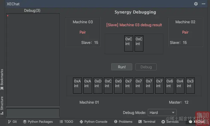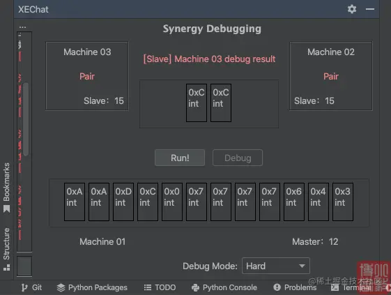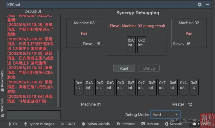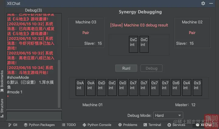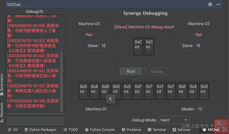 在这个模式中,游戏名称会显示为 “Synergy Debugging” ,译为 “协同调试” ,而玩家昵称会显示为 “Machine 01、Machine 02、Machine 03”,地主被显示为 “Master”,农民被显示为 “Slave”,“过!” 按钮显示为 “Run!”,“出牌” 按钮显示为 “Debug”,像不像是在做什么分布式集群调试?