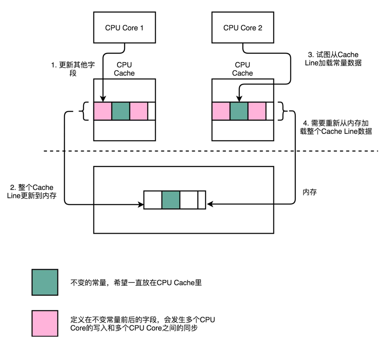 这三个变量很容易放到一个缓存行中,但是之间修改没有太多的关联。所以每次修改,都会使之前缓存的数据失效,从而不能完全达到共享的效果。