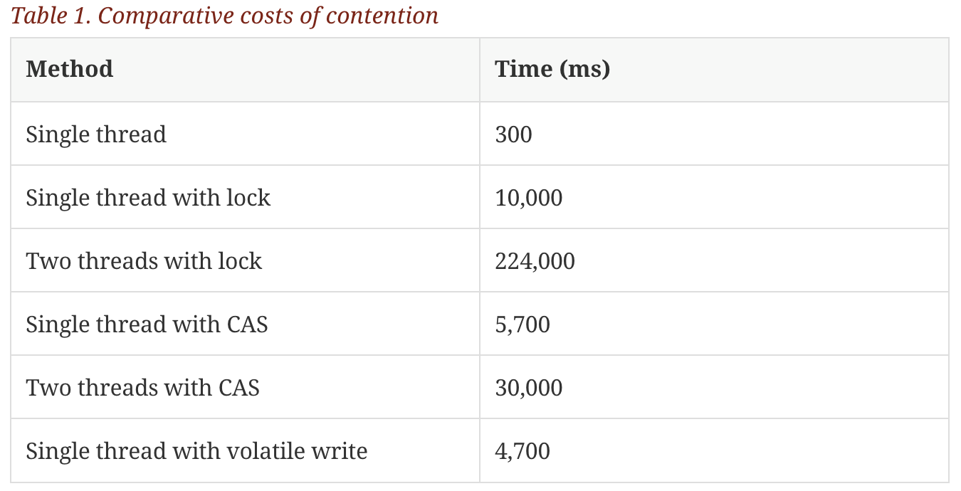 在任何并发环境中,最昂贵的操作是争用写访问。要让多个线程写入同一资源,需要复杂而昂贵的协调。通常,这是通过采用某种锁策略来实现的。
