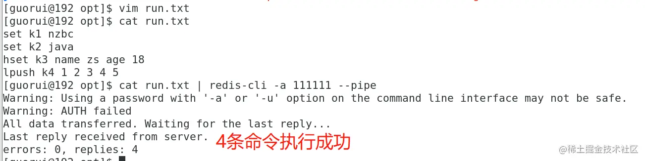 通过 cat run.txt | redis-cli -a 111111 --pipe 命令,体验Redis管道效果。