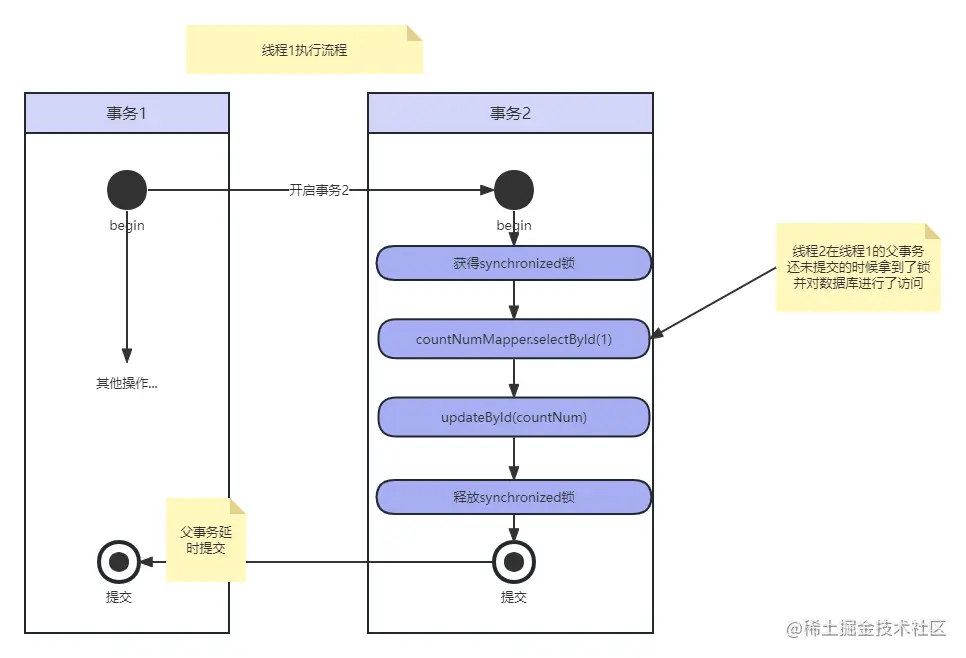 问题就是出在事务与synchronized锁的共同使用导致的,如果既要保证并发不出问题,又要保证在异常的时候需要回滚数据,在实际应用中,getCount()内部又其他对数据库的操作,因此需要事务来保证异常的回滚,也就是一定需要父子事务的嵌套,在这种情况下需要怎么做处理? 首先先来了解事务Transactional与锁synchronized一同使用会带来什么问题。