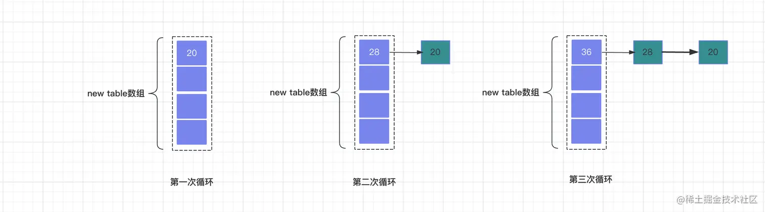 原链表的顺序为:20 -> 28 -> 36; 在经过transfer将数据转移到新的table之和,链表顺序为: 36 -> 28 -> 20