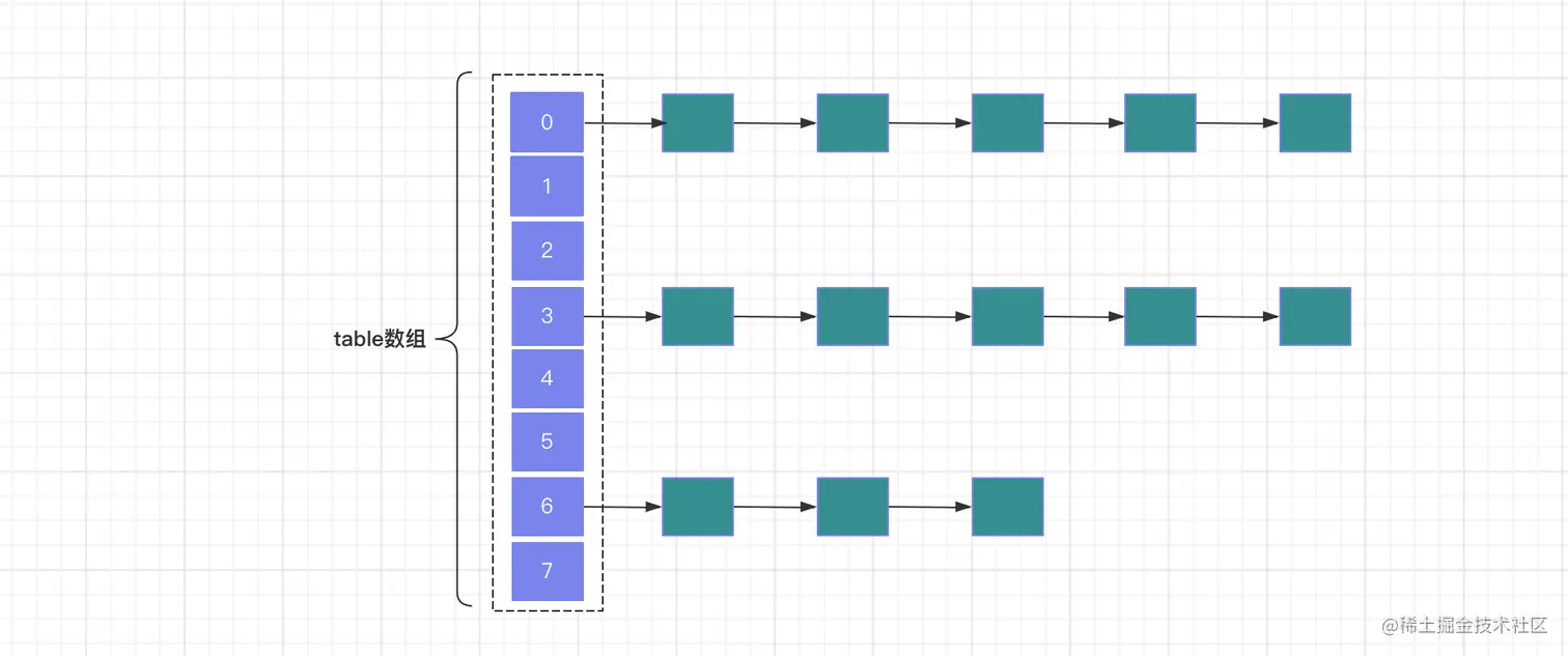 HashMap内部维护了一个数组table,每个元素是一个链表的头结点。链表中存储了具有相同hash值的键值对。在JDK1.7中,HashMap中的键值对使用Entry类表示。Entry类包含四个属性: key, value, hash 值和用于单向链表的next。
