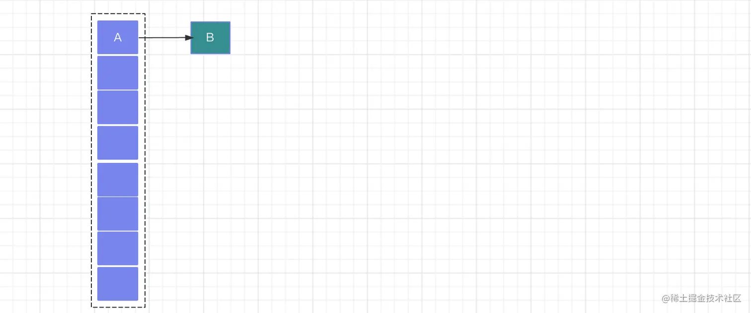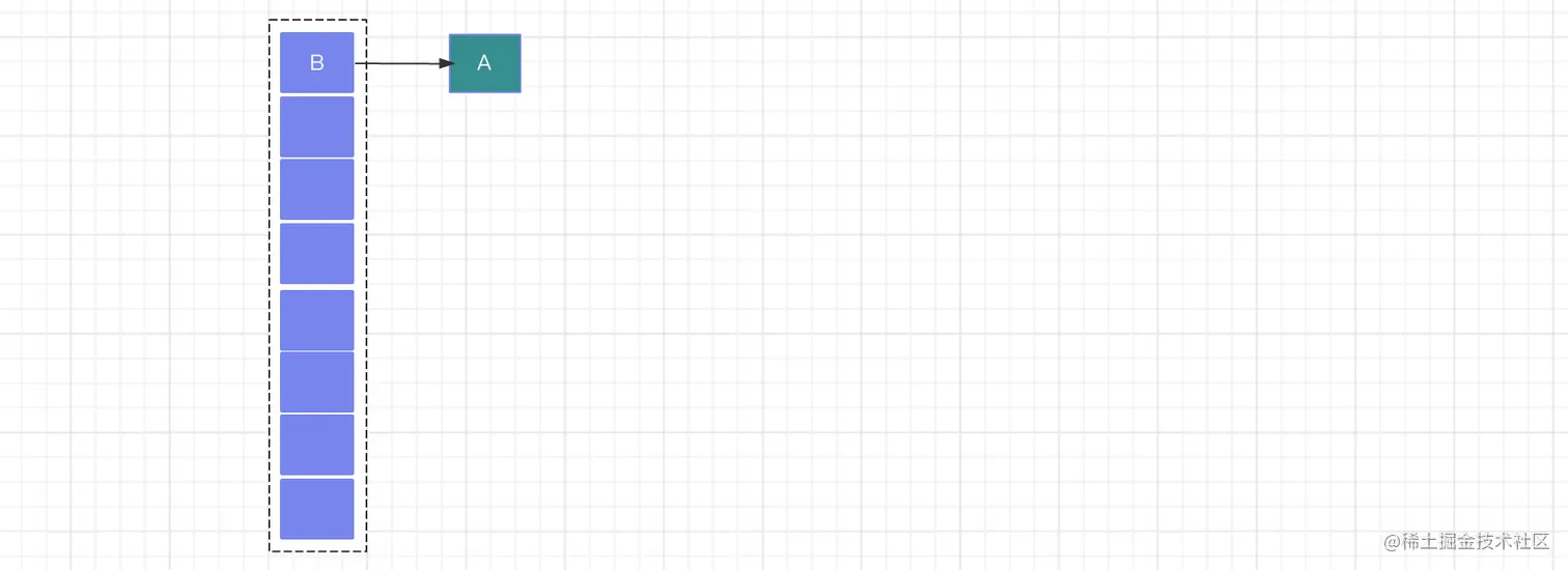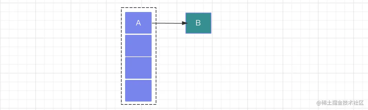 假设有Thread1和Thread2两个线程向HashMap中添加数据,Thread1首先获取执行权,向HashMap插入数据的时候开始扩容,当创建一个新的数组,还没来得及转移旧的数据的时候,Thread2此时获得执行权;那么,对于Thread1而言,此时的HashMap结构如下,链表结构:A -> B