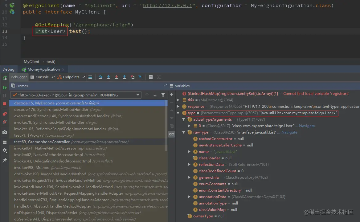 使用自定义Decoder来统一处理,重写Object decode(Response response, Type type)方法,其中Response 就是被调用接口返回的响应,Type就是Feign Client方法的返回值,它的实际类型有两种情况,一种带泛型的类,另外一种是不带泛型的类,分别如下