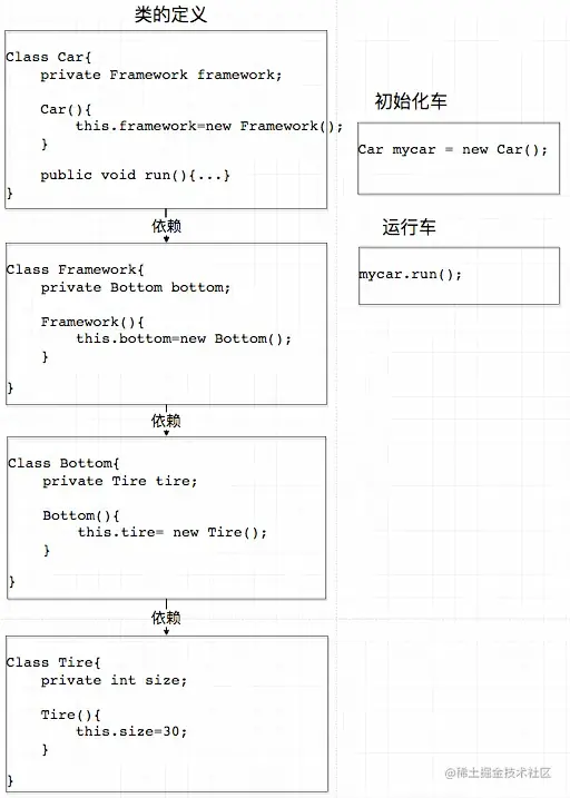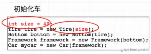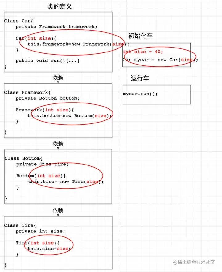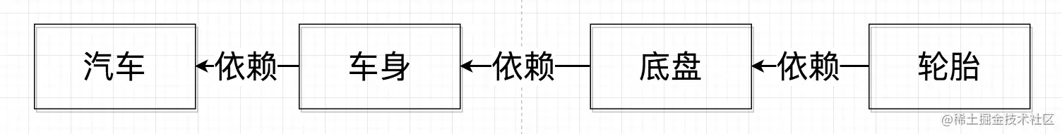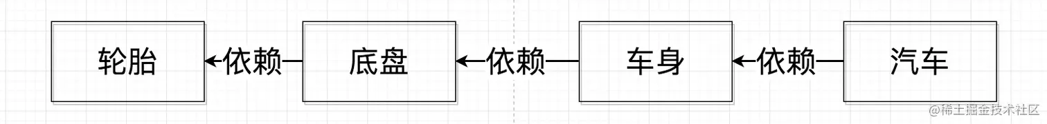 这就是车子的第一个设计思路,上层建筑依赖下层建筑,即每一个类的构造函数都直接调用了底层代码的构造函数。这样就会出现很严重的问题,比如说我现在要把车的轮胎从30改成动态尺寸的,那么我们需要修改整个上层的所有构造函数!