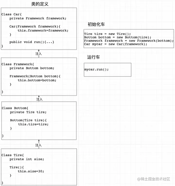 为了方便理解,先定义四个 Class,车,车身,底盘,轮胎。然后初始化这辆车,最后跑这辆车。代码结构如下: