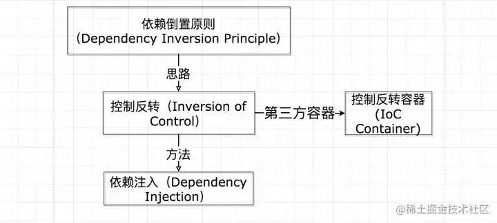 控制反转(Inversion of Control) 就是依赖倒置原则的一种代码设计的思路。具体采用的方法就是所谓的依赖注入(Dependency Injection) ,这几种概念的关系大概如下: