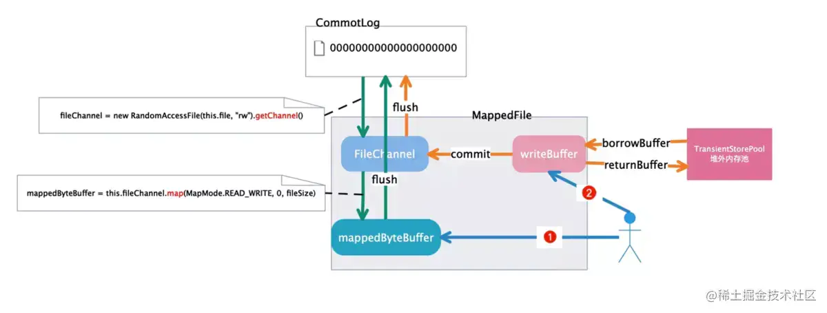 在理解RocketMQ刷盘实现之前,先理解一下上图展示的刷盘的2种实现的: