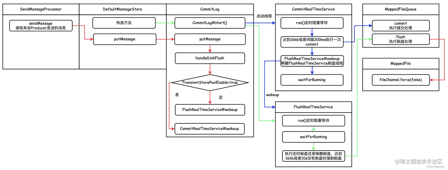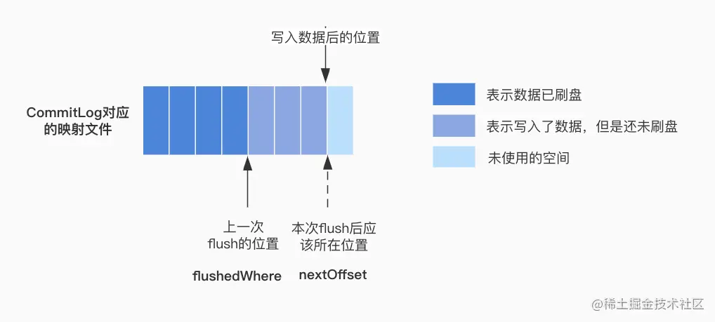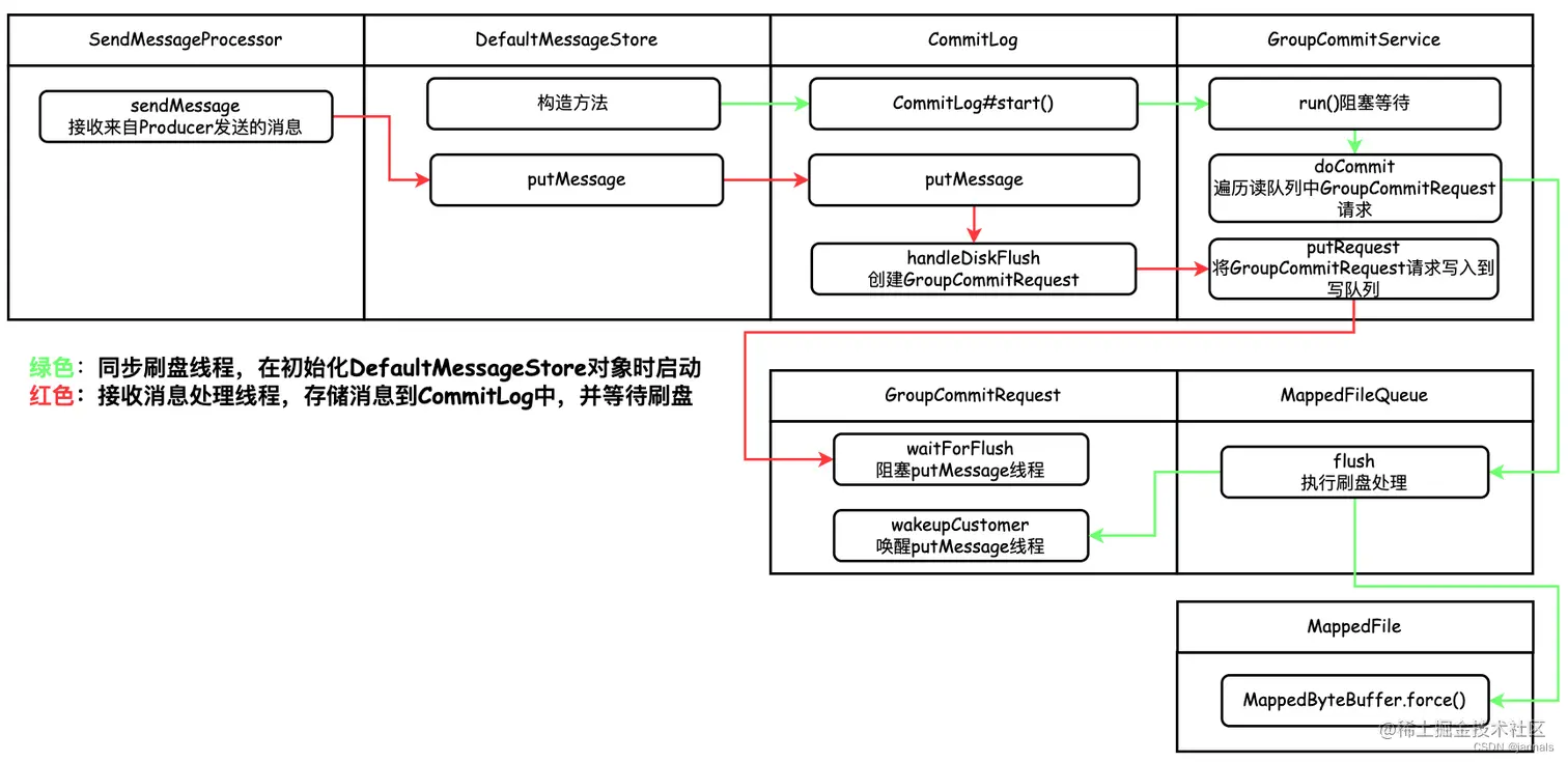 同步刷盘,消息追加到内存后,将同步调用MappedByteBuffer的force()方法; - 如果是