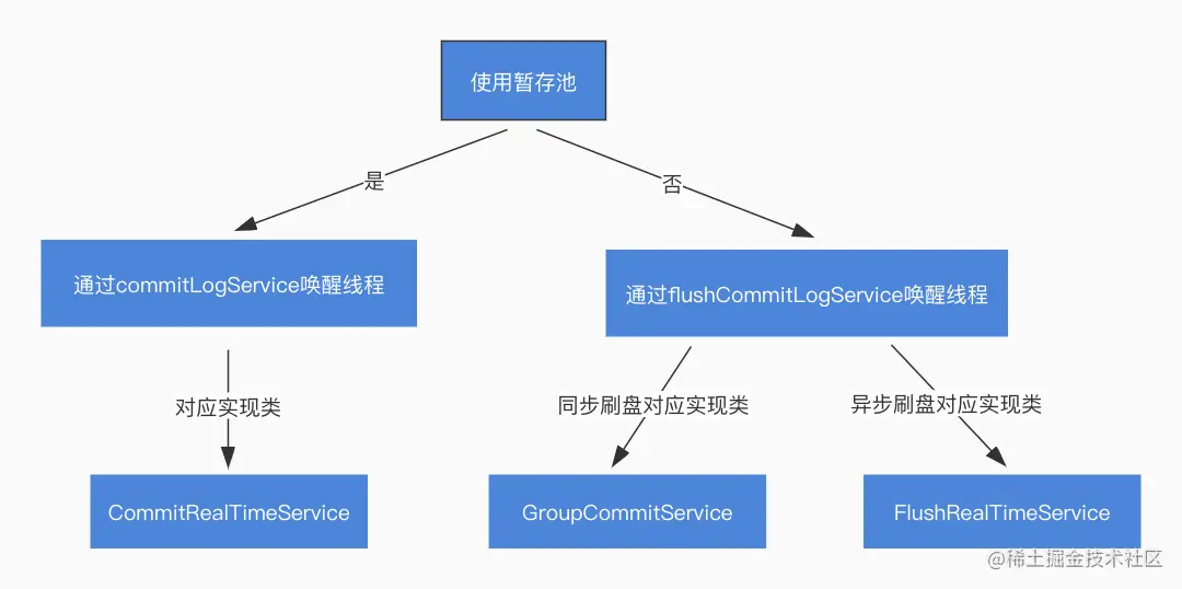 // 如果使用暂存池,使用commitLogService,先将数据写入到FILECHANNEL,然后统一进行刷盘