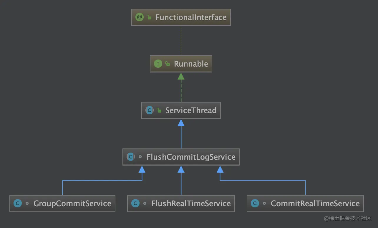 GroupCommitService是CommitLog的内部类,从继承关系中可知它实现了Runnable接口,在run方法调用waitForRunning等待刷盘请求的提交,然后处理刷盘,不过这个线程是在什么时候启动的呢?