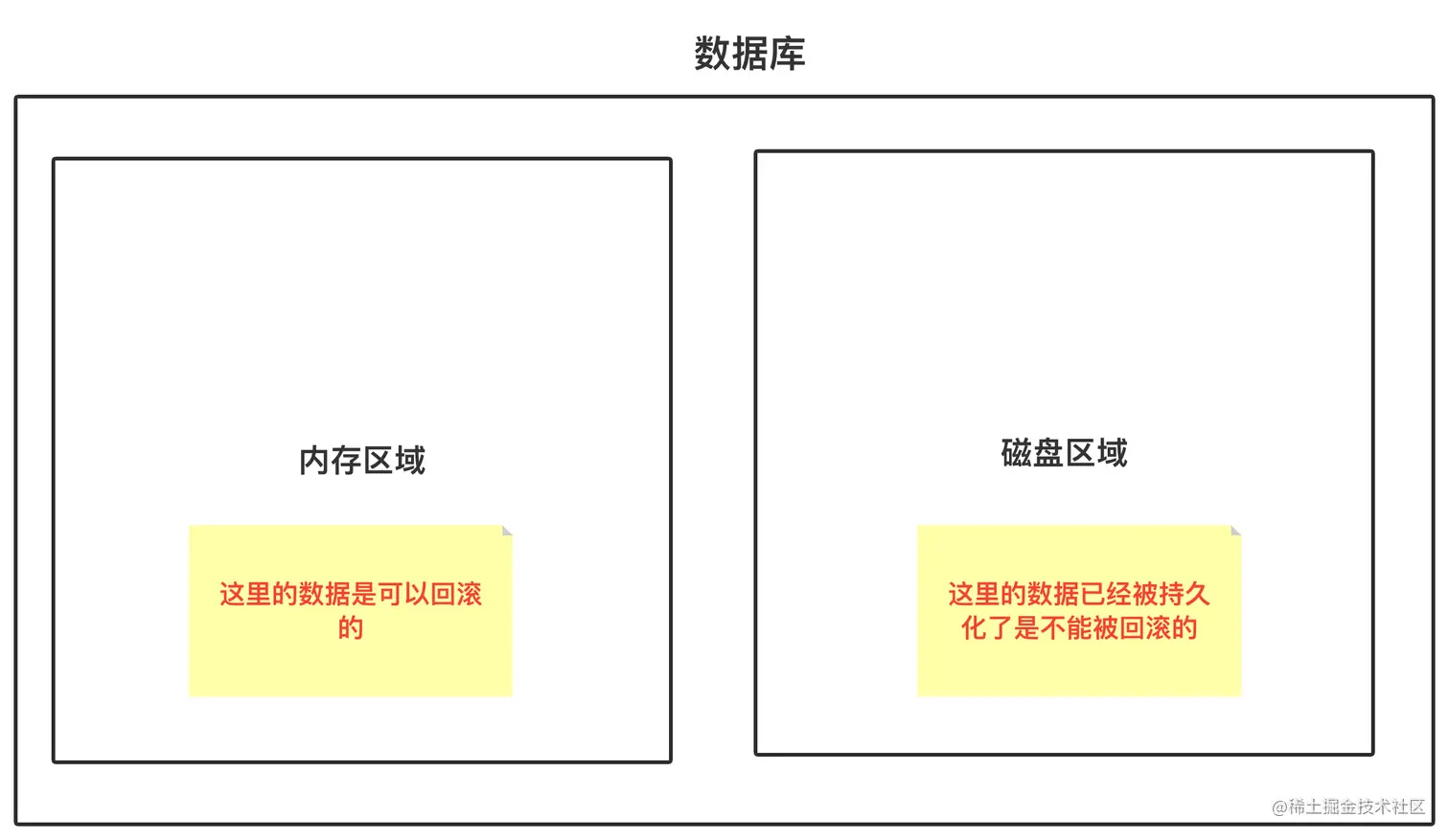 首先要清楚的是数据库是分两片区域的一个是磁盘存储区域最后持久化的数据会存放到这里还有一个是内存区域,也就是还没有commit之前的数据先放到内存区域中,提交完成后才会持久化到磁盘中。如下图所示: