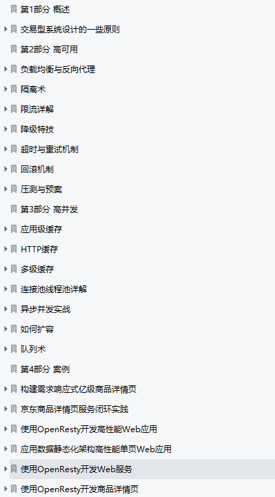 第二份京东架构核心技术分为4部分分别是系统设计概述,高可用,高并发,以及系统设计实战案例,共21个章节: