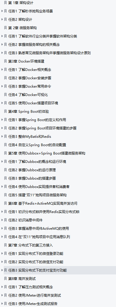 此文档一共有8个章节,主要记录淘宝双十一抢购项目搭建流程以及具体实现细节