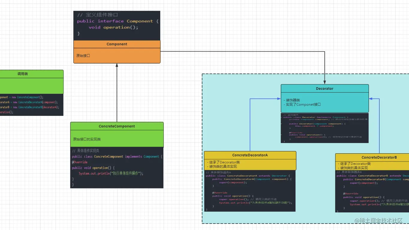 在上面的示例中,我们首先定义了一个Component接口和一个ConcreteComponent实现类,后者提供了基础的功能。然后,我们定义了一个Decorator装饰器类,并在其中包装了一个Component类型的引用,该类实现了Component接口并提供了与被装饰者相同的行为。