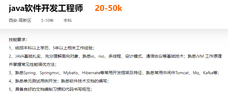 金三银四过去一半,市场火热,但是大家就业压力却没有缓解多少。 很多粉丝后台留言,Java程序员面临的竞争太激烈了…… 我自己也有实感,多年身处一线互联网公司,虽没有直面过求职跳槽的残酷,但经常担任技术面试考官,对程序员招聘市场的现状很清楚。导致现在激烈竞争的原因不外乎三方面:人多了,技术需求高了,中低端岗位不缺人了... 虽然行业红利在消失,但这绝不是最坏的时代,只是回归理性和稳定,我们除了要判断趋势,还要看到本质。 想要破局,可以直接从招聘信息的解析中迈出第一步。