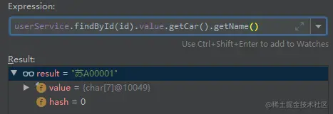 Optional[com.example.sbjdemo.pojo.User@30c311e6] 通过控制台可以看出,只有一个用户查询的 sql,结果也就是一个 user 的实体类数据。那我们的 car 信息该如何查看呢?其实我们可以使用查询结果 result 去 get 我们所需要的数据,如下图所示: