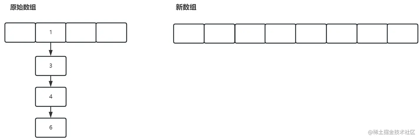 假如当前我需要将数组从 16 扩容至 32,我们看下原来的结构: