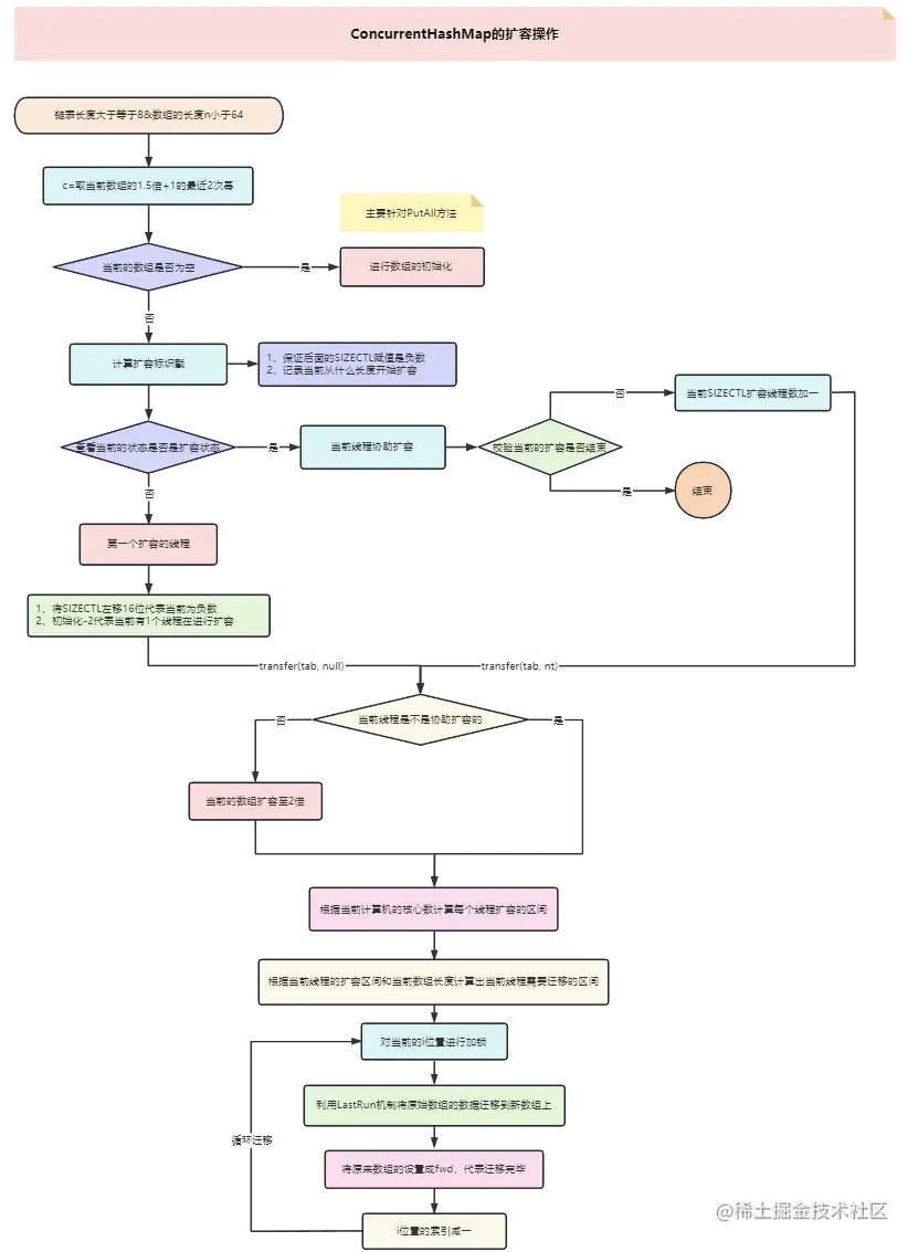 // 如果当前的hash是正在扩容 if ((fh = f.hash) == MOVED){ // 进行协作式扩容 tab = helpTransfer(tab, f); } final Node<K,V>[] helpTransfer(Node<K,V>[] tab, Node<K,V> f) { Node<K,V>[] nextTab; int sc; // 第一个判断:老数组不为null // 第二个判断:新数组不为null (将新数组赋值给nextTab) if (tab != null && (f instanceof ForwardingNode) && (nextTab = ((ForwardingNode<K,V>)f).nextTable) != null) { // 拿到扩容戳 int rs = resizeStamp(tab.length); // 第一个判断:fwd中的新数组,和当前正在扩容的新数组是否相等。 // 相等:可以协助扩容。不相等:要么扩容结束,要么开启了新的扩容 // 第二个判断:老数组是否改变了。 相等:可以协助扩容。不相等:扩容结束了 // 第三个判断:如果正在扩容,sizeCtl肯定为负数,并且给sc赋值 while (nextTab == nextTable && table == tab && (sc = sizeCtl) < 0) { // 判断扩容戳是否一致 // 看下transferIndex是否小于0,如果小于的话,说明扩容的任务已经被领完了 if ((sc >>> RESIZE_STAMP_SHIFT) != rs || sc == rs + 1 || sc == rs + MAX_RESIZERS || transferIndex <= 0) break; // 如果还有任务的话,CAS将当前的SIZECTL加一,协助扩容 if (U.compareAndSwapInt(this, SIZECTL, sc, sc + 1)) { // 协助扩容的代码,上面刚刚分析过 transfer(tab, nextTab); break; } } return nextTab; } return table; }