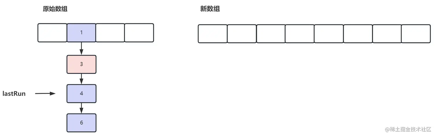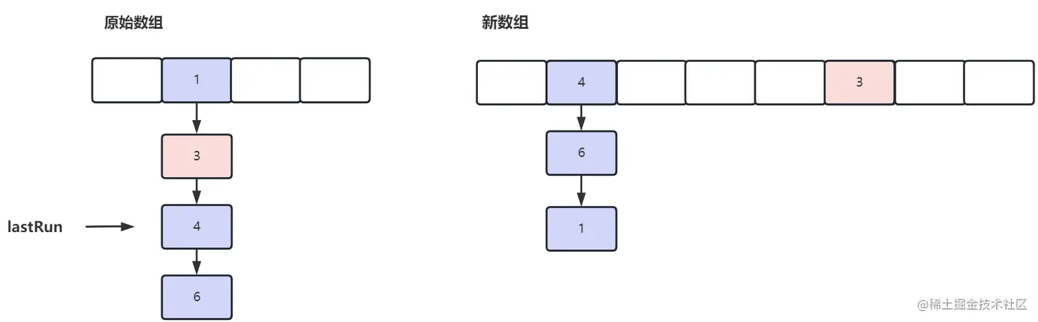 最后将我们的数组从原始数组直接迁移过来,由于 lastRun 之后位置的数据都是一样的hash,所以直接全量迁移即可,不需要挨个遍历,这也是实施 lastRun 的原因,减少时间复杂度
