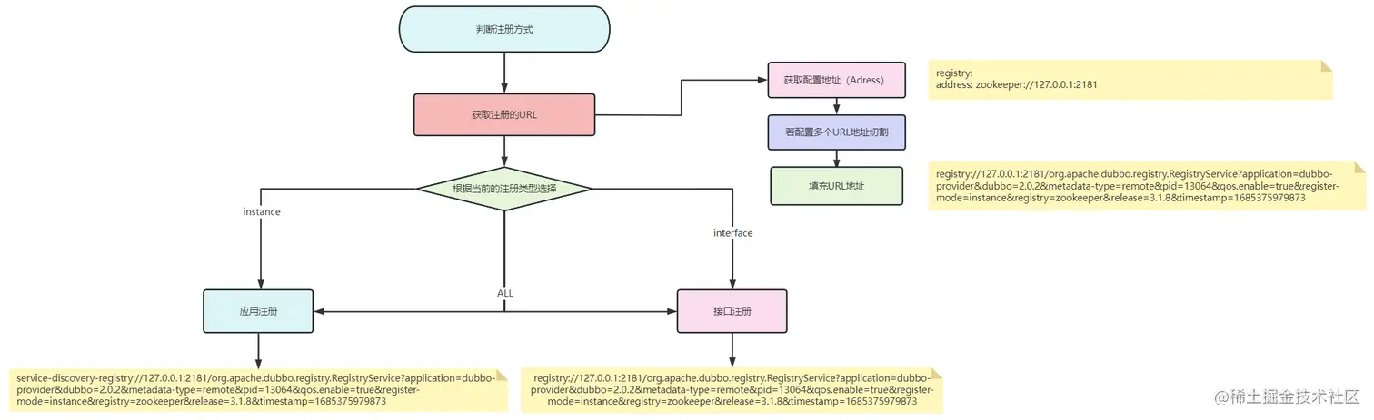 Exporter<?> exporter = protocolSPI.export(invoker); public <T> Exporter<T> export(final Invoker<T> originInvoker) throws RpcException { // 暴露服务 final ExporterChangeableWrapper<T> exporter = doLocalExport(originInvoker, providerUrl); // 获取注册的Registry final Registry registry = getRegistry(registryUrl); final URL registeredProviderUrl = getUrlToRegistry(providerUrl, registryUrl); // 注册方式的选择 boolean register = providerUrl.getParameter(REGISTER_KEY, true) && registryUrl.getParameter(REGISTER_KEY, true); if (register) { // 这里有两种注册情况: // 1、接口注册:直接将注册数据注册到Zookeeper即可 // 2、应用注册:将注册数据转换成元数据等后面发布元数据 register(registry, registeredProviderUrl); } }