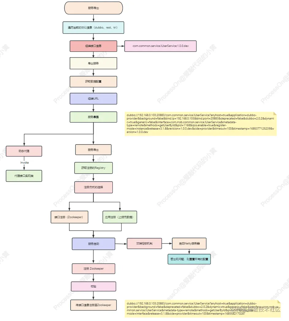 public void doRegister(URL url) { // 校验 checkDestroyed(); // 将接口信息注册至Zookeeper zkClient.create(toUrlPath(url), url.getParameter(DYNAMIC_KEY, true), false); } // URL:dubbo://192.168.0.103:20883/com.common.service.IUserService?anyhost=true&application=dubbo-provider&background=false&deprecated=false&dubbo=2.0.2&dynamic=true&generic=false&interface=com.msb.common.service.IUserService&metadata-type=remote&methods=getUserById&pid=12752®ister-mode=interface&release=3.1.8&side=provider&timeout=100×tamp=1685542170287
