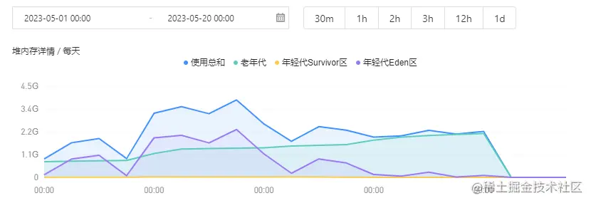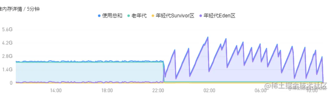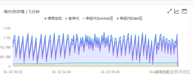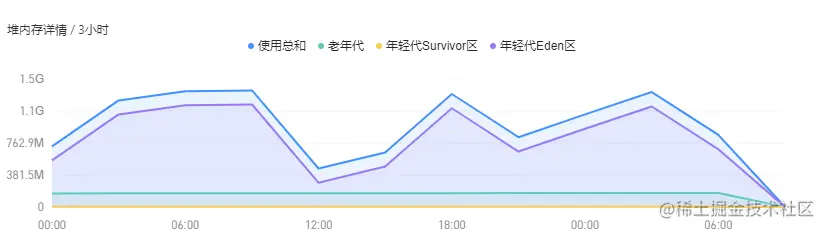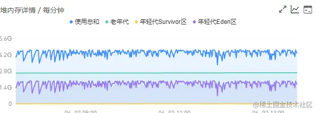 首先,年轻代会占大多数,永久代占一小部分,所以年轻代的波动和总理差不多。