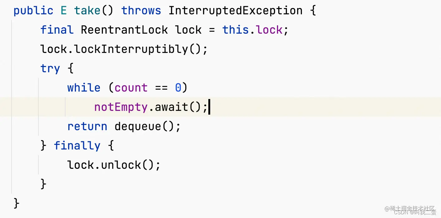 - 此时如果来了消费者2抢到了锁资源并带走了数据的话,消费者1再次拿到锁资源时,无法从队列获取到任何元素,出现虚假唤醒问题。