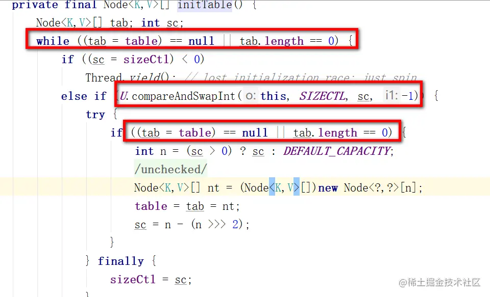 基于CAS来保证初始化线程安全的,这里不但涉及到了CAS去修改sizeCtl的变量去控制线程初始化数据的原子性,同时还使用了DCL,外层判断数组未初始化,中间基于CAS修改sizeCtl,内层再做数组未初始化判断。