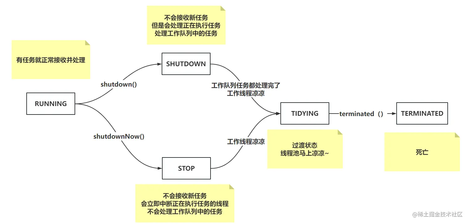 线程池有5个状态:RUNINING、SHUTDOWN、STOP、TIDYING、TERMINATED