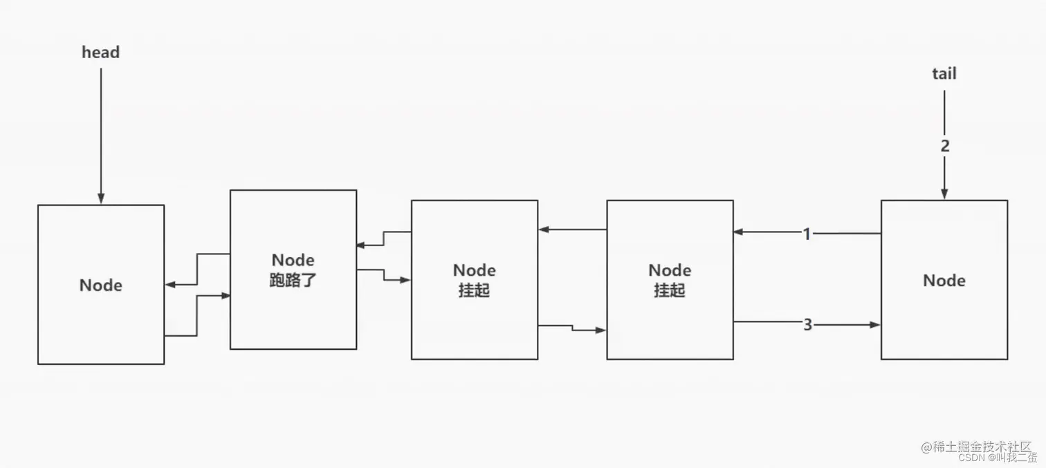 如下图,当一个新的Node添加到链表时有3个步骤,当第三个步骤还未完成时,如果从head开始就找不到需要被唤醒的节点了。