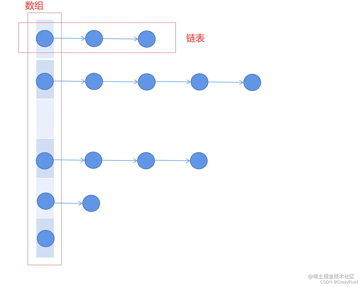 - 链地址法:发生冲突的时候,后到来的元素在原有位置的基础上,使用链表的方式存储。(排队)