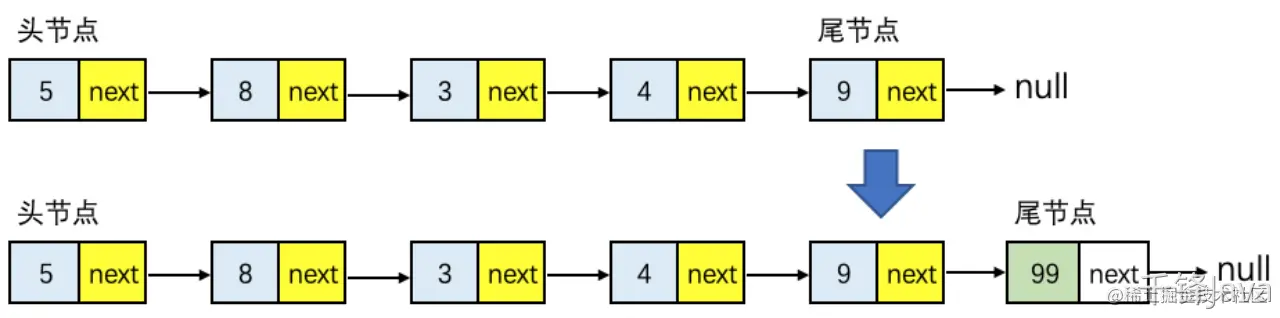 时间复杂度分析:如上图所示,若尾部插入结点,则需要从头开始遍历,因此单向链表添加尾结点的时间复杂度是O(n)。