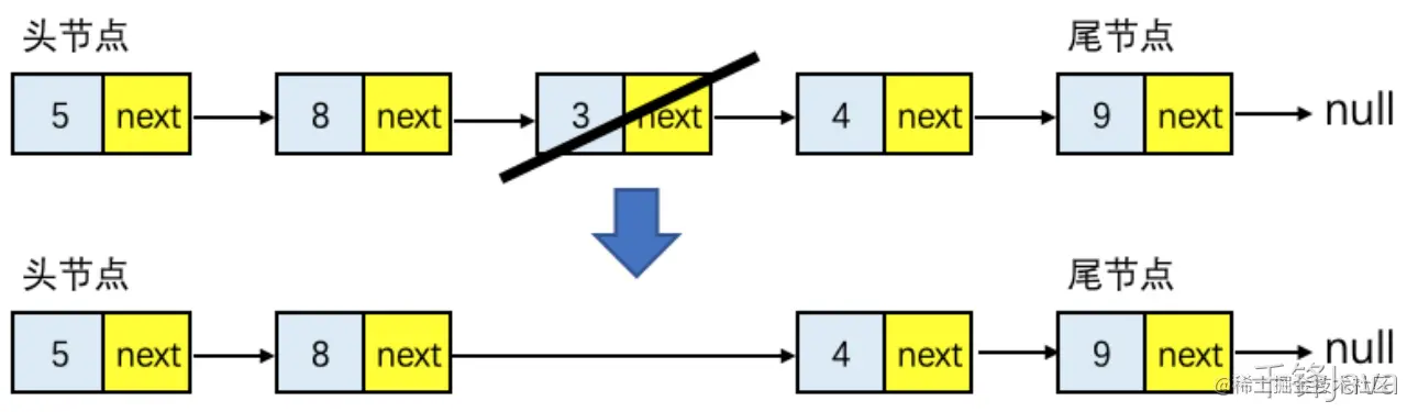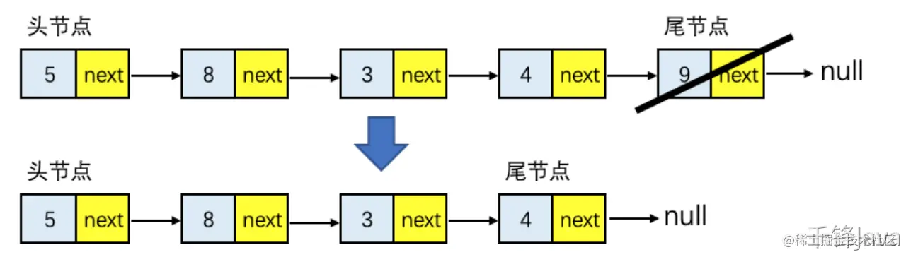 时间复杂度分析:因为要从头开始遍历,所以单向链表删除尾结点的时间复杂度是O(n)。