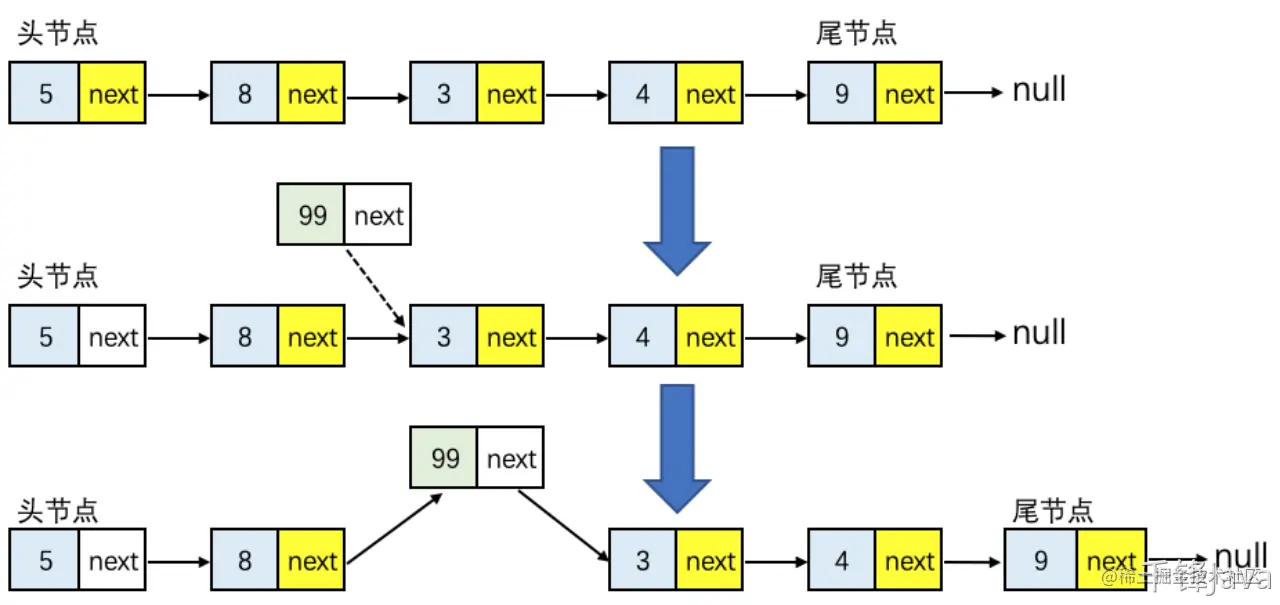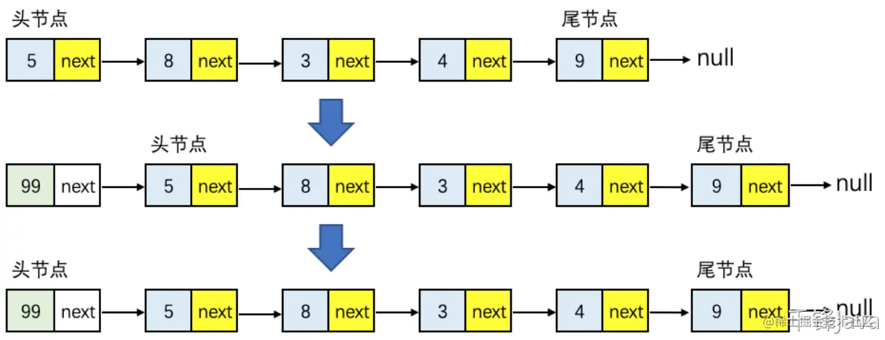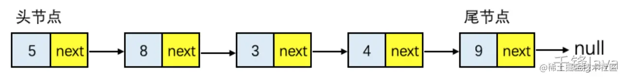 链表的每一个结点分布在内存的不同位置,依靠next指针关联起来。这样可以灵活有效地利用零散的碎片空间。链表的第一个结点被称为头结点,没有任何结点的next指针指向它,它的前置结点为空null。头结点用来记录链表的基地址。有了它,就可以遍历得到整条链表的数据。链表的最后一个结点被称为尾结点,它的next指向为空null。