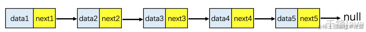 链表中的每个结点都由两部分组成:数据域、指针域。数据域用来存放当前结点需要存储的数据内容,指针域用于存放当前结点的下一个结点的地址。如下图所示: