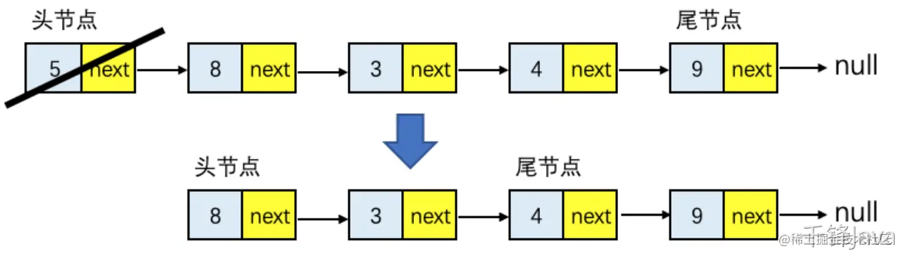 头部删除与头部插入操作类似,只需要把链表的头结点设为原先头结点的next指针即可如图: