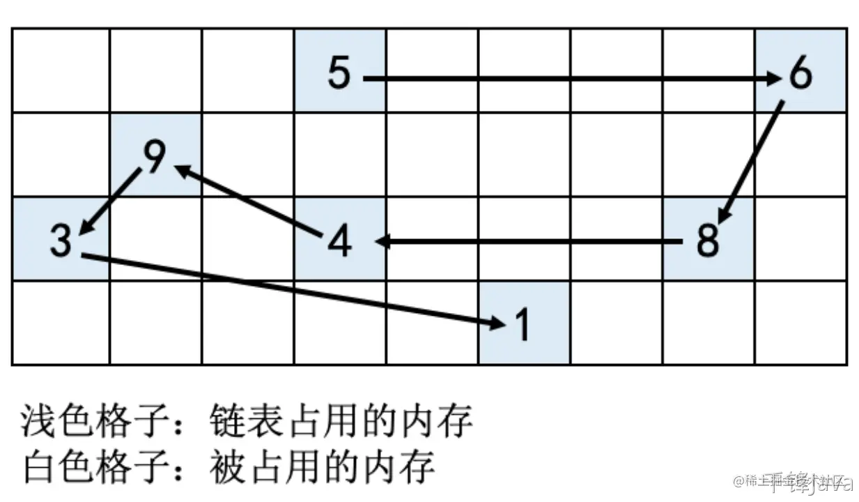 数组在内存中的存储方式是顺序存储(连续存储),链表在内存中的存储方式则是随机存储,如下图所示: